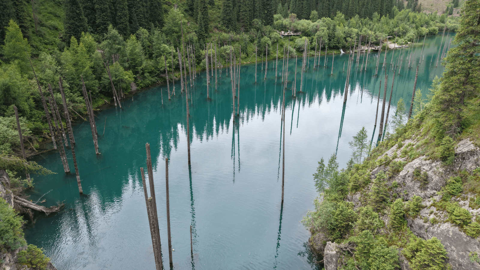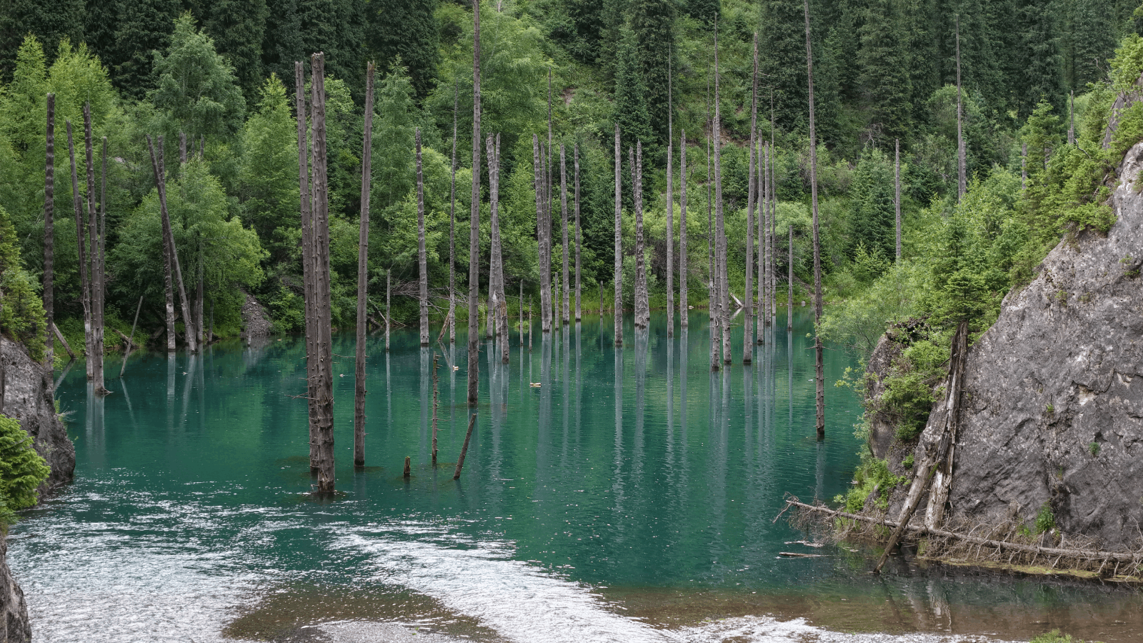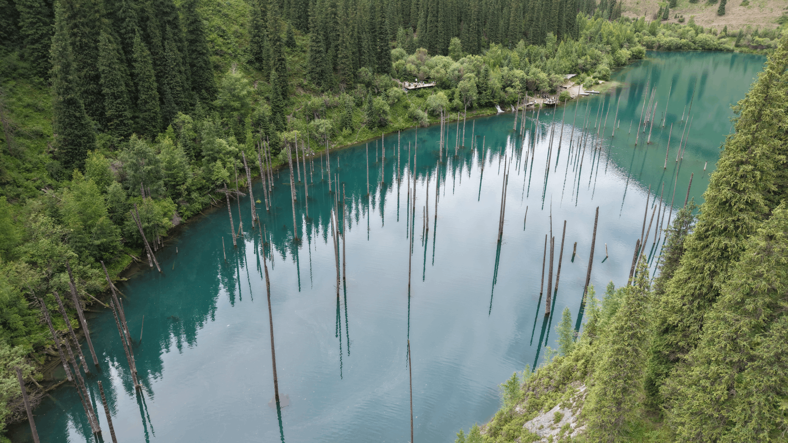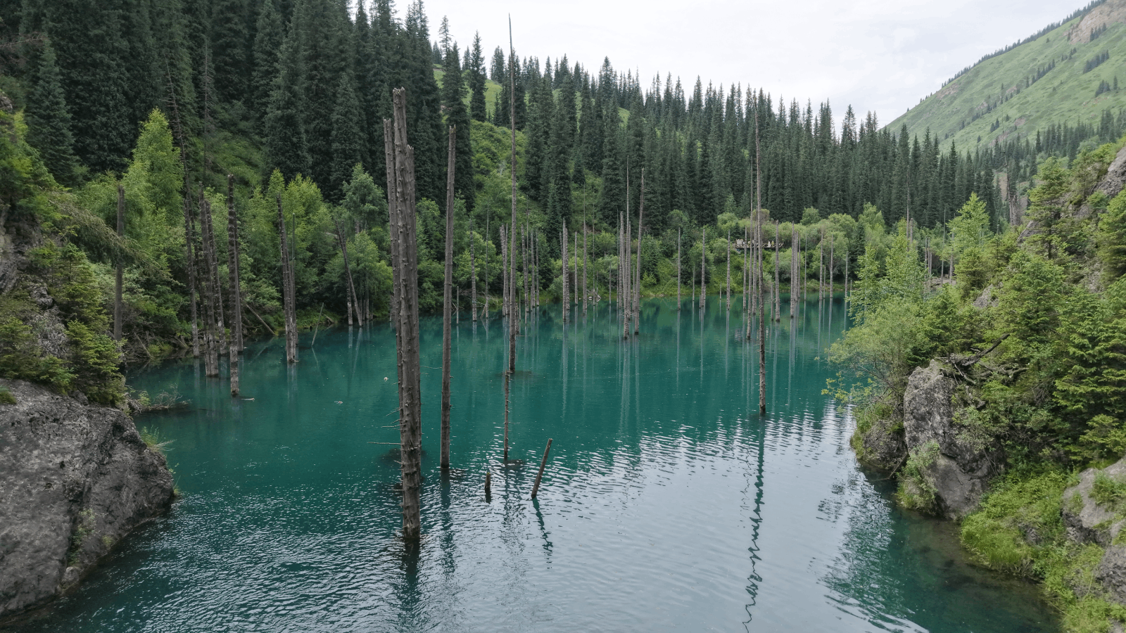 Kaindy Lake is unlike anything you’ve seen before. Formed in 1911 after a powerful earthquake triggered a landslide that flooded a spruce forest, this mystical lake is now famous for its partially submerged trees that eerily rise from turquoise waters like ghostly towers.