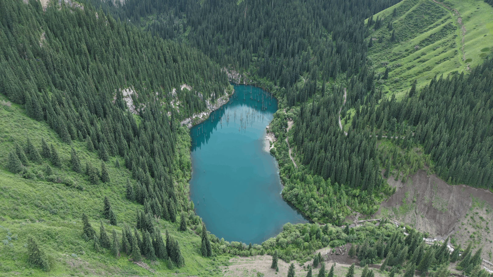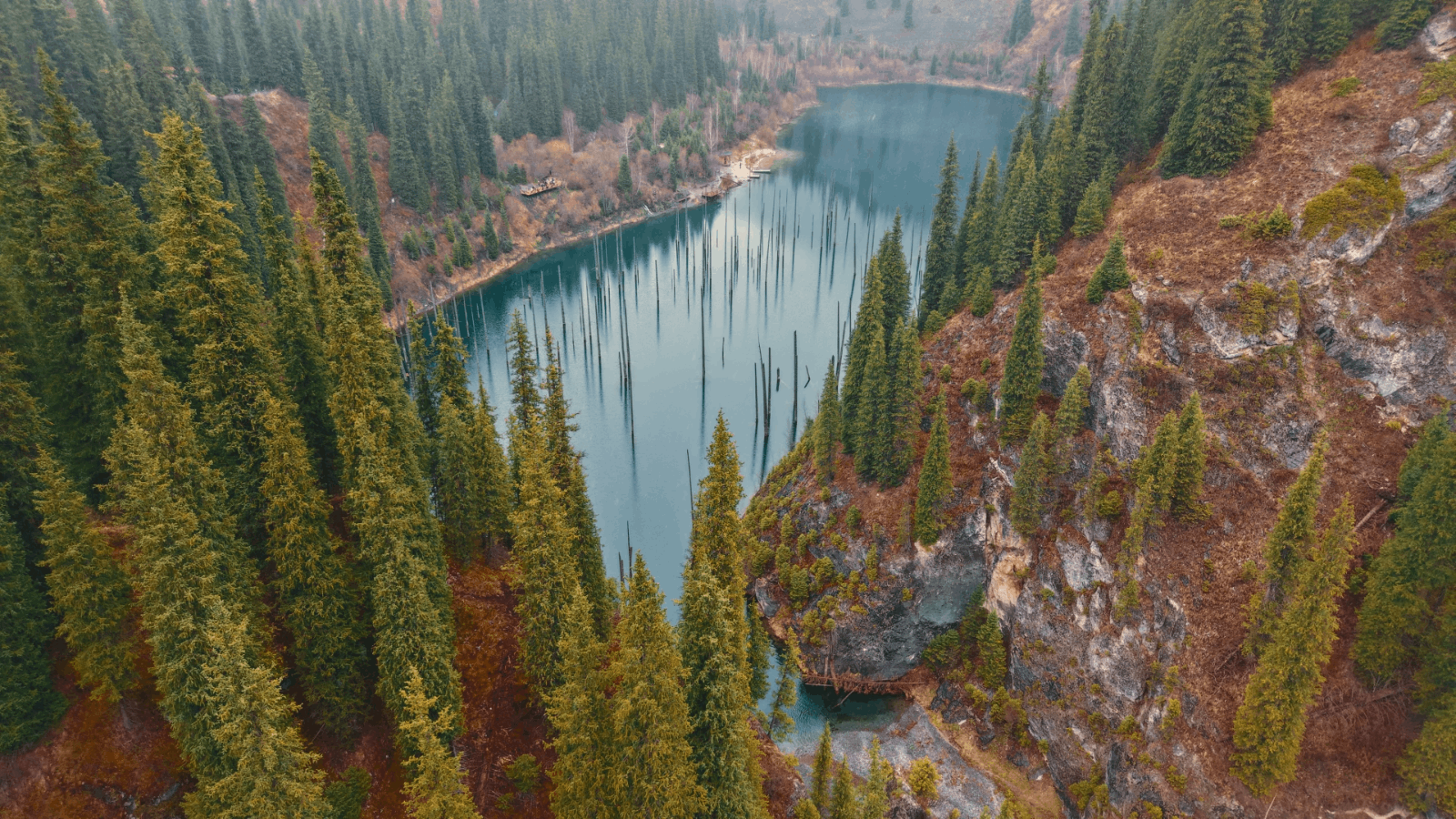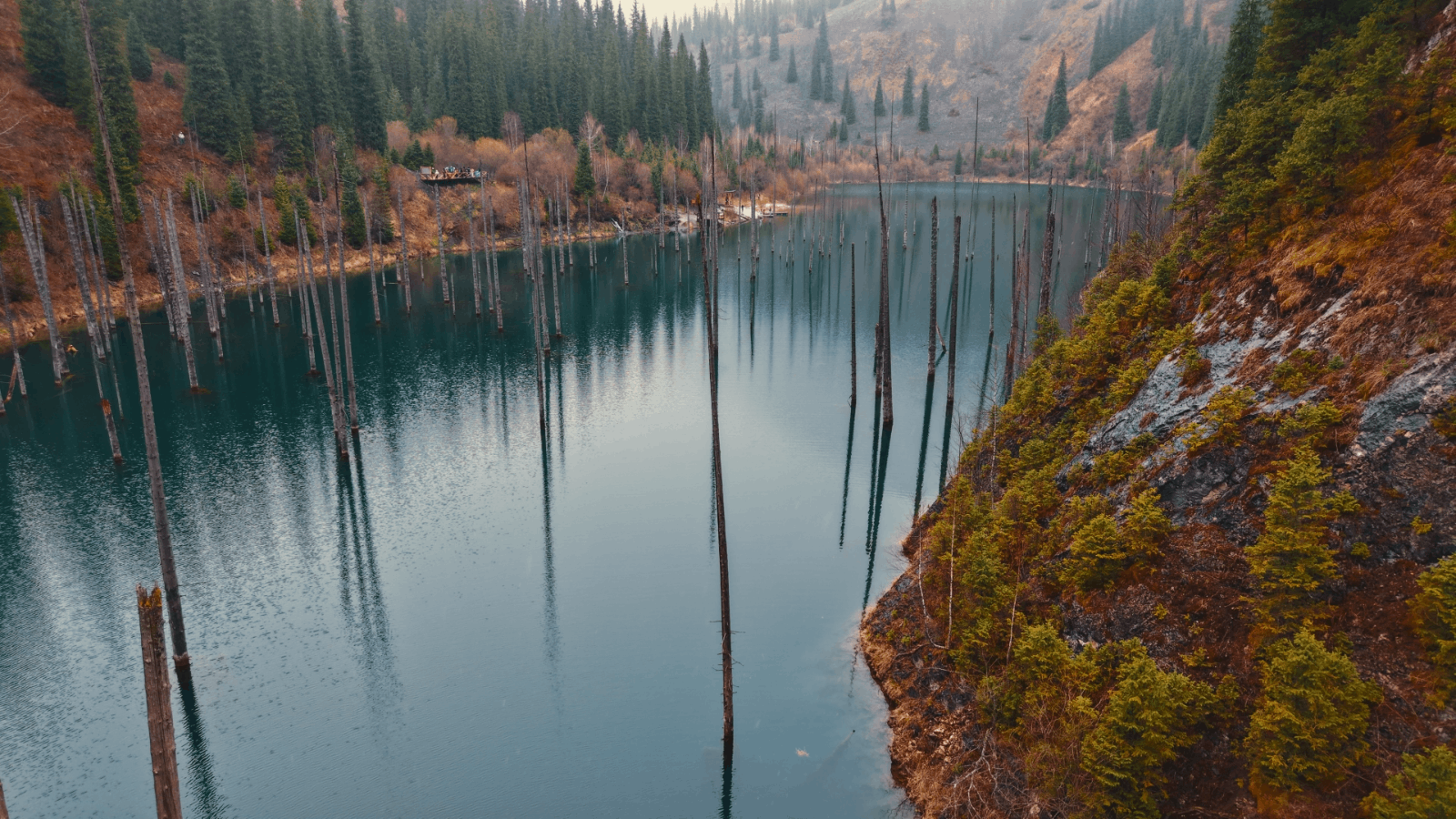 Kaindy Lake is unlike anything you’ve seen before. Formed in 1911 after a powerful earthquake triggered a landslide that flooded a spruce forest, this mystical lake is now famous for its partially submerged trees that eerily rise from turquoise waters like ghostly towers.